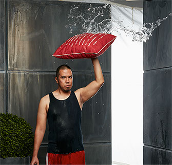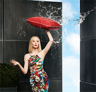 The source image was retouched and color-adjusted. Then water splashes and droplets were imported from outtake shots to create the splash effect, demonstrating the water-resistance of the fabric. Shown above is an automated slideshow case study of this photo composition from start to finish.