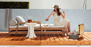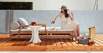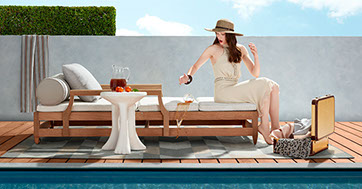 The source image was retouched and color-corrected, with the rug, background and pool in the foreground added. The woman's arm position was also changed. Shown above is an automated slideshow case study of this photo composition from start to finish.